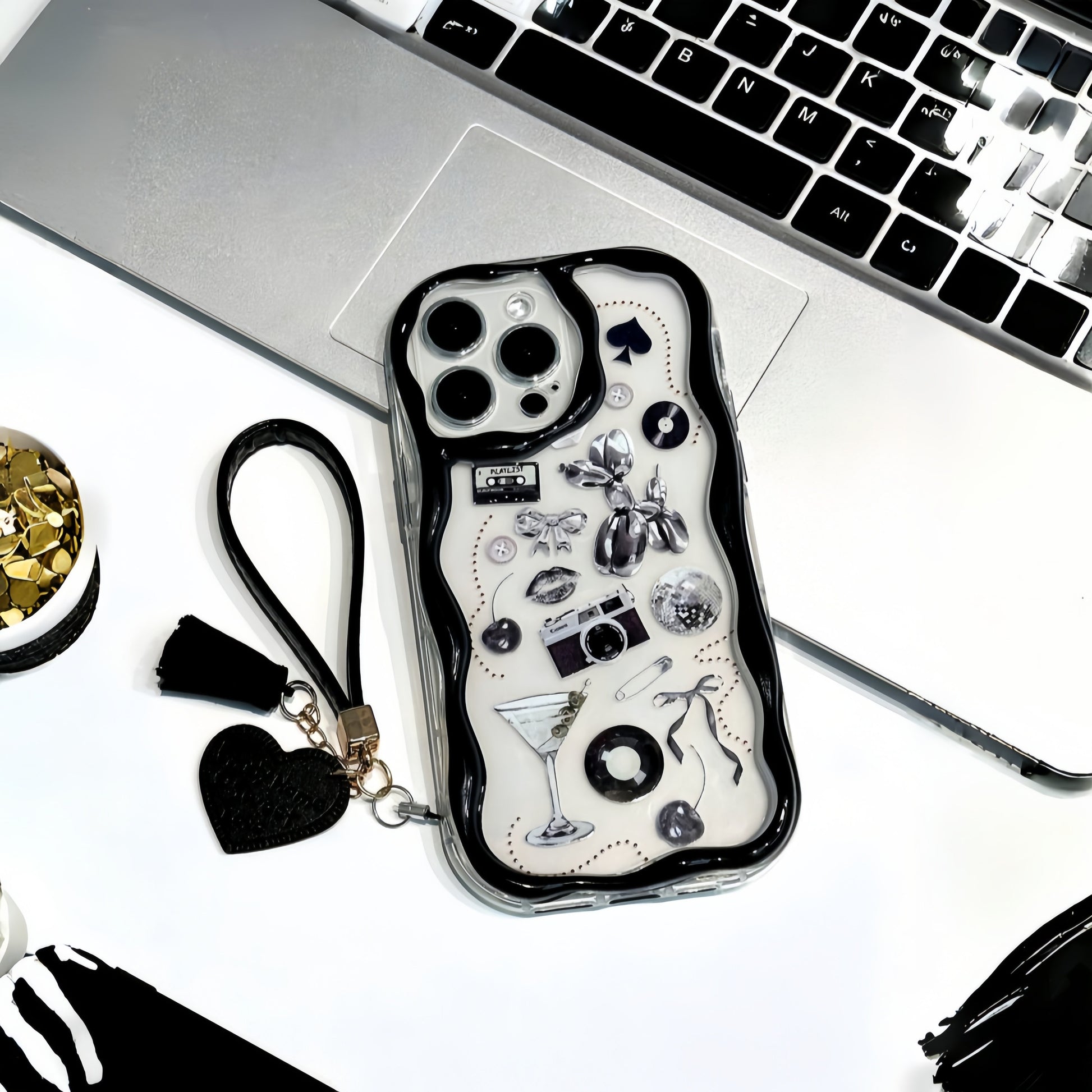 Each charm — from the retro camera to the disco sphere — tells a story of expression, joy, and creativity. The 3D metallic icons shine like tiny diyas against a polished base, giving your phone a look that’s both bold and beautifully festive.